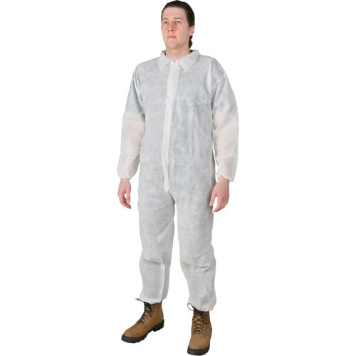 Zenith white polypropylene coveralls. Polypropylene permits breathability and comfort. Offers protection against non-hazardous and non-toxic liquids, dust and particles. Economical disposable option for protection in grimy work environments. Elastic wrists and ankles. Front zipper for optimum fit. Applications: Food processing, laboratories/pharmaceutical, warehouses, maintenance, manufacturing/assembly and dusty environments. 100% latex-free. **Minimum purchase of 50**