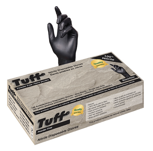 TUFF BLACK NITRILE GLOVES 4Mil Black Industrial-grade, 100% nitrile disposable glove with no fillers and no natural rubber latex protein (latex free). Puncture and tear-resistant, with excellent sensitivity. More durable for prolonged usage. Better protection against oil, grease and organic solvents. Conform to EN374 and EN455 standards.