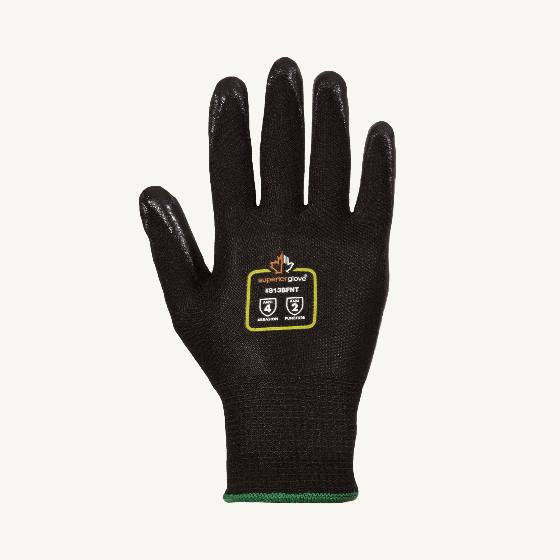 Flexible, nitrile-dipped work gloves. Foam nitrile acts like a sponge to give you a strong, steady grip in light oil. ANSI Level 4 abrasion resistant and ANSI Level 2 puncture resistant. Polyester seamless-knit shell is fast-drying and moisture-wicking. Uncoated back of the hand for cool comfort and flexibility. Touchscreen compatible to seamlessly move between tasks.