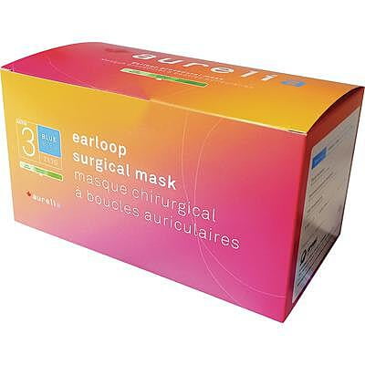 Aurelia earloop surgical mask with enclosed aluminum nosepiece: 3-ply, ASTM Level 3, BFE: 98% (160mmHg), fluid-resistant, high breathability, extremely soft, latex-free and graphene-free. 50 units per box. Made in Canada.