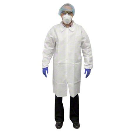 Lab coat with snap closures and elastic around the wrists. Longer length for better protection. No pockets. Polypropylene material offers some splash resistance while keeping the worker cool and comfortable. Polypropylene provides a fluid and particulate barrier to protect the worker without sacrificing mobility and comfort. Garments constructed of 25 gram polypropylene fabric are strong and durable, yet offer outstanding comfort, breathability and softness.