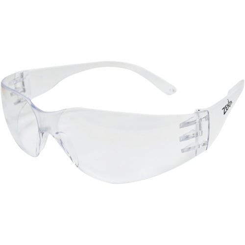 Zenith Safety Products - Z3100 series safety glasses, clear lens, anti-scratch coating, CSA Z94.3/ANSI Z87+. Scratch-resistant polycarbonate lens with UV protection. Frameless design with extended wraparound coverage. Near total seal of the eye provides superior protection. Distortion-free lenses. **Must be ordered in multiples of 12**