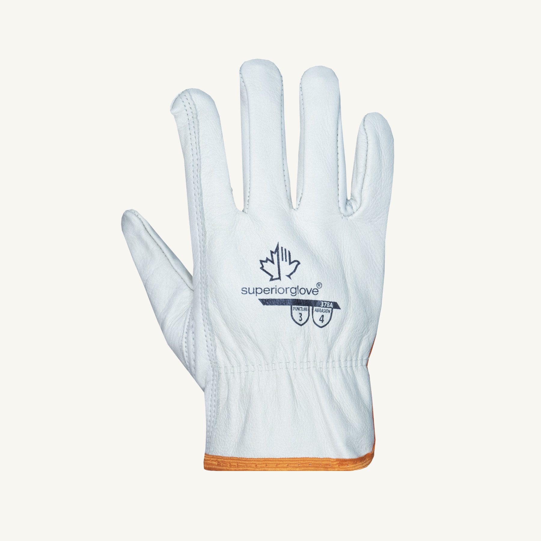 Endura® 378A are durable cowhide gloves for low hazard protection and material handling. Provide durable protection from scuffs and scrapes, making them ideal for material handling, light construction tasks, and low hazard site clean up. The keystone thumb design maximizes durability for a longer wear life while the elasticized wrists offer a snug fit for all day comfort. ANSI 4 abrasion / ANSI 3 puncture. **Min. 12 pairs**