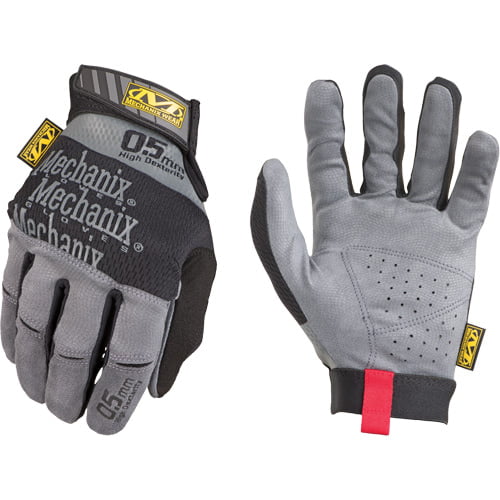Mechanix Wear High Dexterity Gloves with synthetic palm. Thermoplastic Rubber (TPR) closure provides a secure fit to the wrist. Form-fitting, breathable TrekDry® material keeps hands cool and comfortable. Three-dimensional patterning forms to the natural curvature of the hand. Flex inserts improve finger mobility. High-dexterity 0.5mm AX-Suede™ palm material provides precision feel. Hourglass finger design eliminates material overlap. Machine washable. EN 388 Level 1 for abrasion resistance, cut resistance and puncture resistance. EN 388 Level 2 for tearing strength rating.