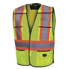 Pioneer high visibility lime-yellow safety vest. CSA Z96 Class 2 - Level 2. StarTech® reflective tape. 5 point tear-away. 4 storage pockets. Radiophone clip strap and D ring access slot. One size.