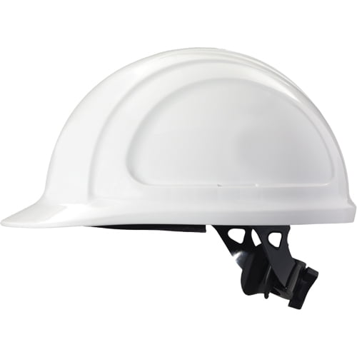 Honeywell - North Zone™ hardhat, ratchet suspension, white. Slots for cap-mounted earmuffs, face shields and other PPE accessories. 3-level height adjustment (Low, Medium, High) for greater stability, balance and retention. Removable, replaceable rear comfort cradle for improved fit and comfort. Easy-grip ratchet for smooth and precise headband adjustment, even when wearing gloves. Ergonomic headband for easy adjustment to 3 different sizes (S, M/L and XL). Moisture-wicking, breathable sweatband; easily removable, washable and replaceable Short brim and low-profile design for increased field of vision and user mobility. Approved to be worn in the reverse position. ANSI Class E/CSA Class E, ANSI Type I/CSA Type 1.